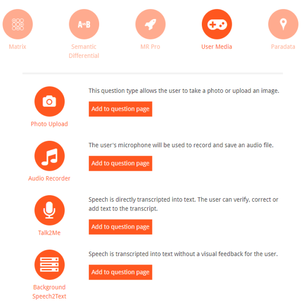 Audio Recorder:The Audio Recorder records spoken language and allows later to listen to the recorded language. This type of question is suitable for sound bites from consumers. In a classical research process, this type of question would have to be transcribed later.